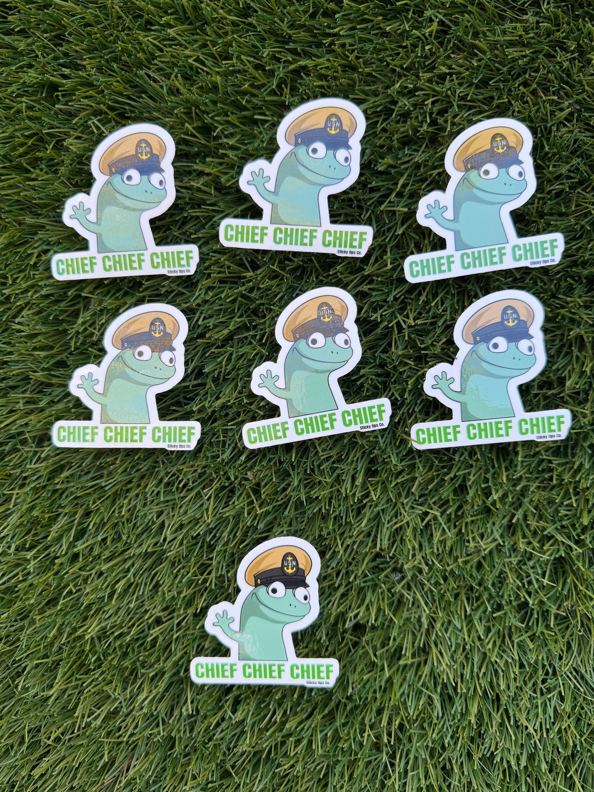 Straight outta viral internet fame and into the Mess — the legendary green lizard just made rank. This 2.5-inch vinyl sticker features the internet’s favorite lizard rocking a Navy Chief’s cover, proudly shouting “Chief, Chief, Chief!” in full “lead from the front” energy or NOT?!