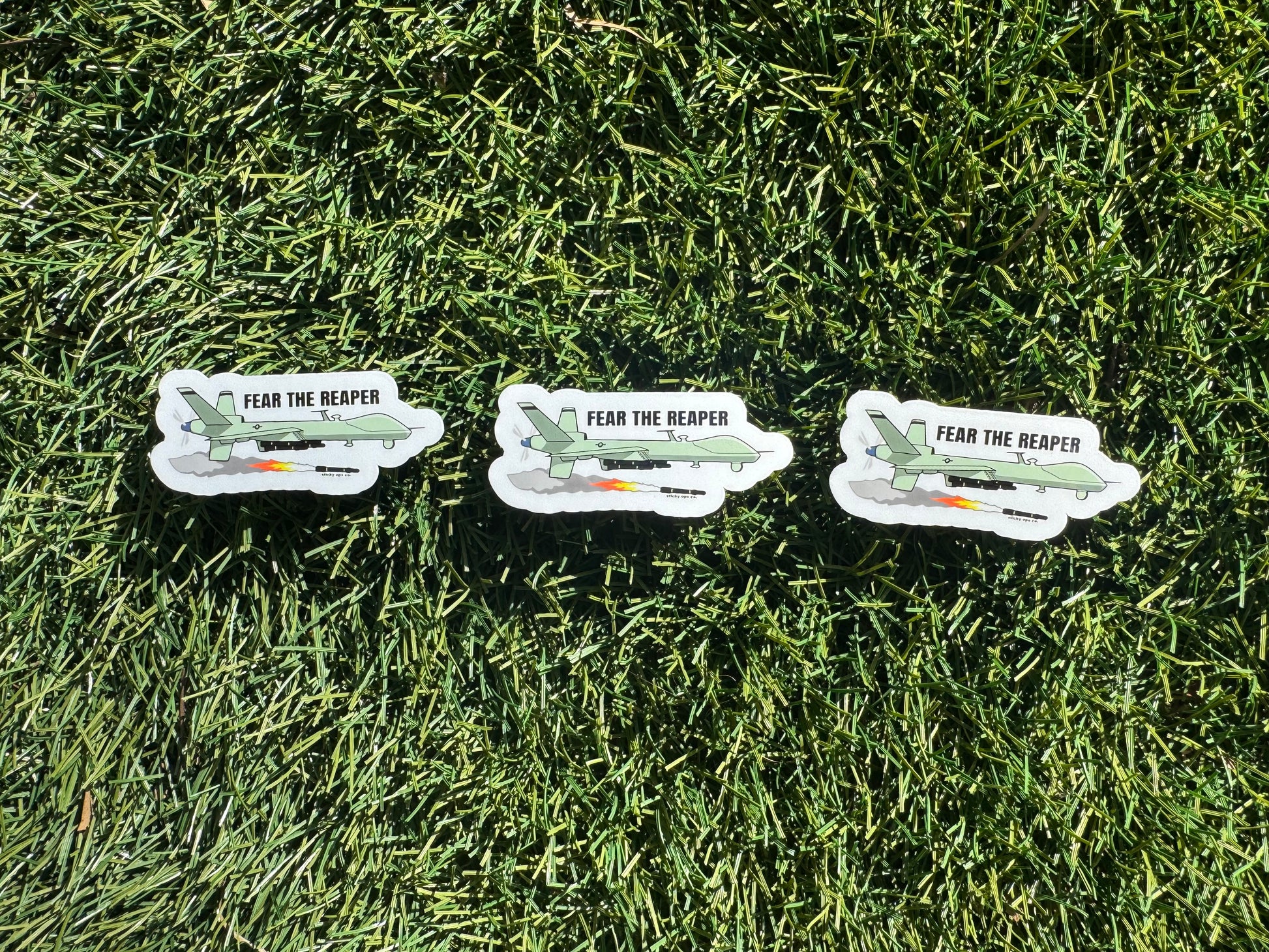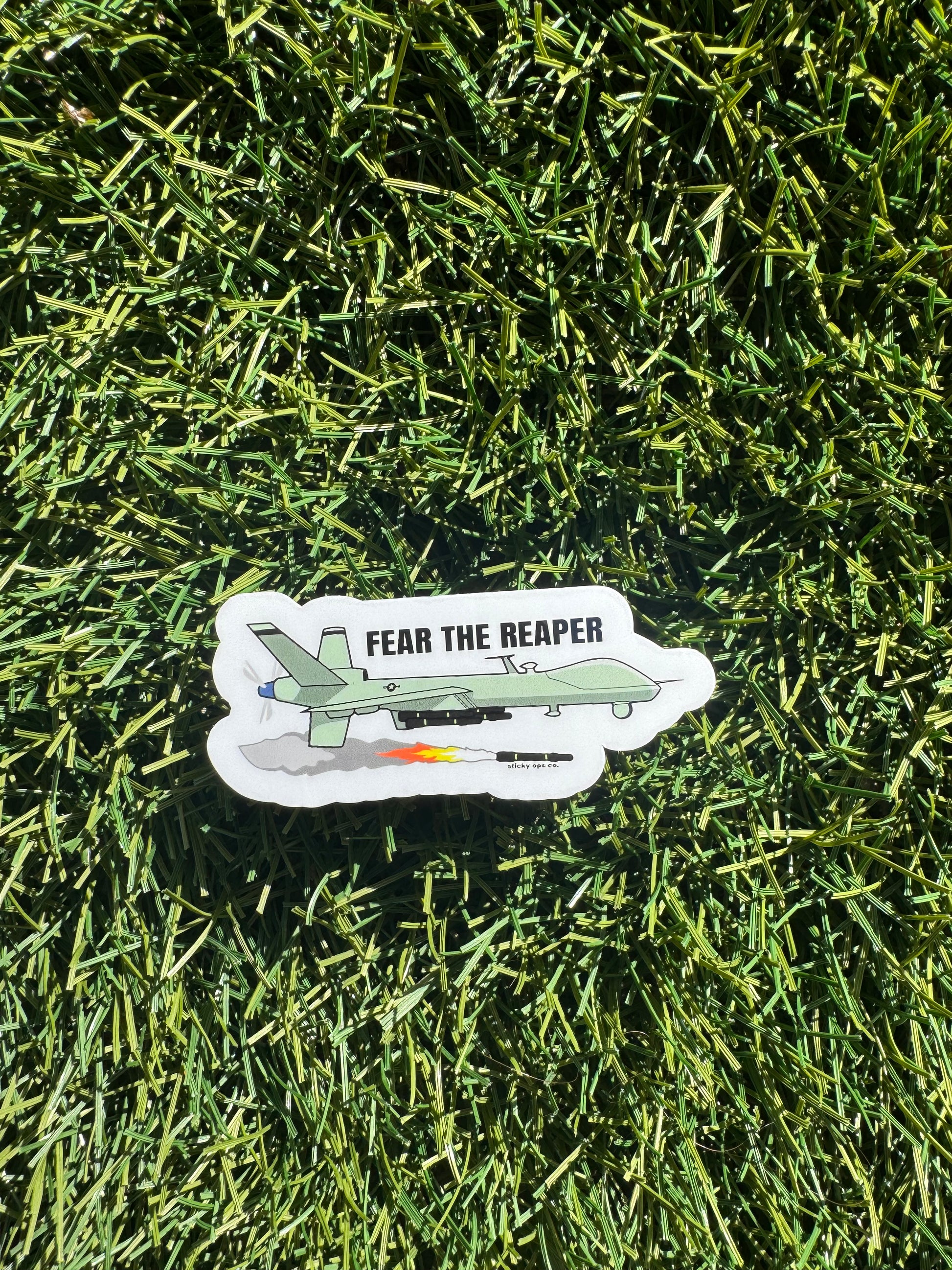 A bold nod to modern airpower and dark military humor. This “Fear the Reaper” sticker features a clean illustrated MQ-9-style drone in flight, capturing the unmistakable silhouette that lives rent-free in the minds of its enemies. Minimalist, sharp, and unapologetic—this design hits whether you’re aviation-minded, military-adjacent, or just appreciate iconic deterrence energy.