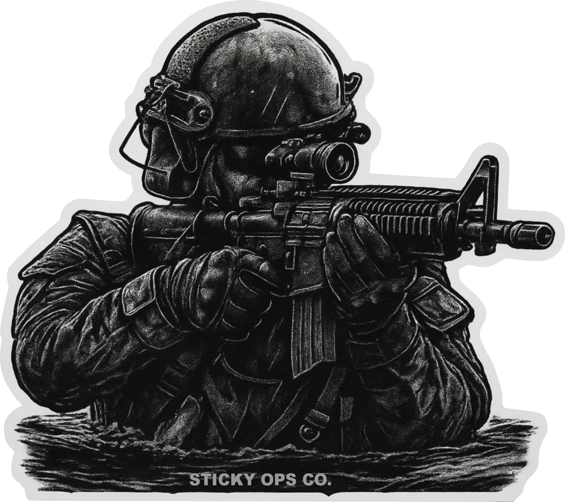 This one’s all grit and no gloss. The Gritty Operator sticker showcases a skeleton warrior geared up with night vision, helmet, and rifle — locked in and ready for action. The black-and-white detail brings out a raw, gritty realism that makes this design stand out from the rest.