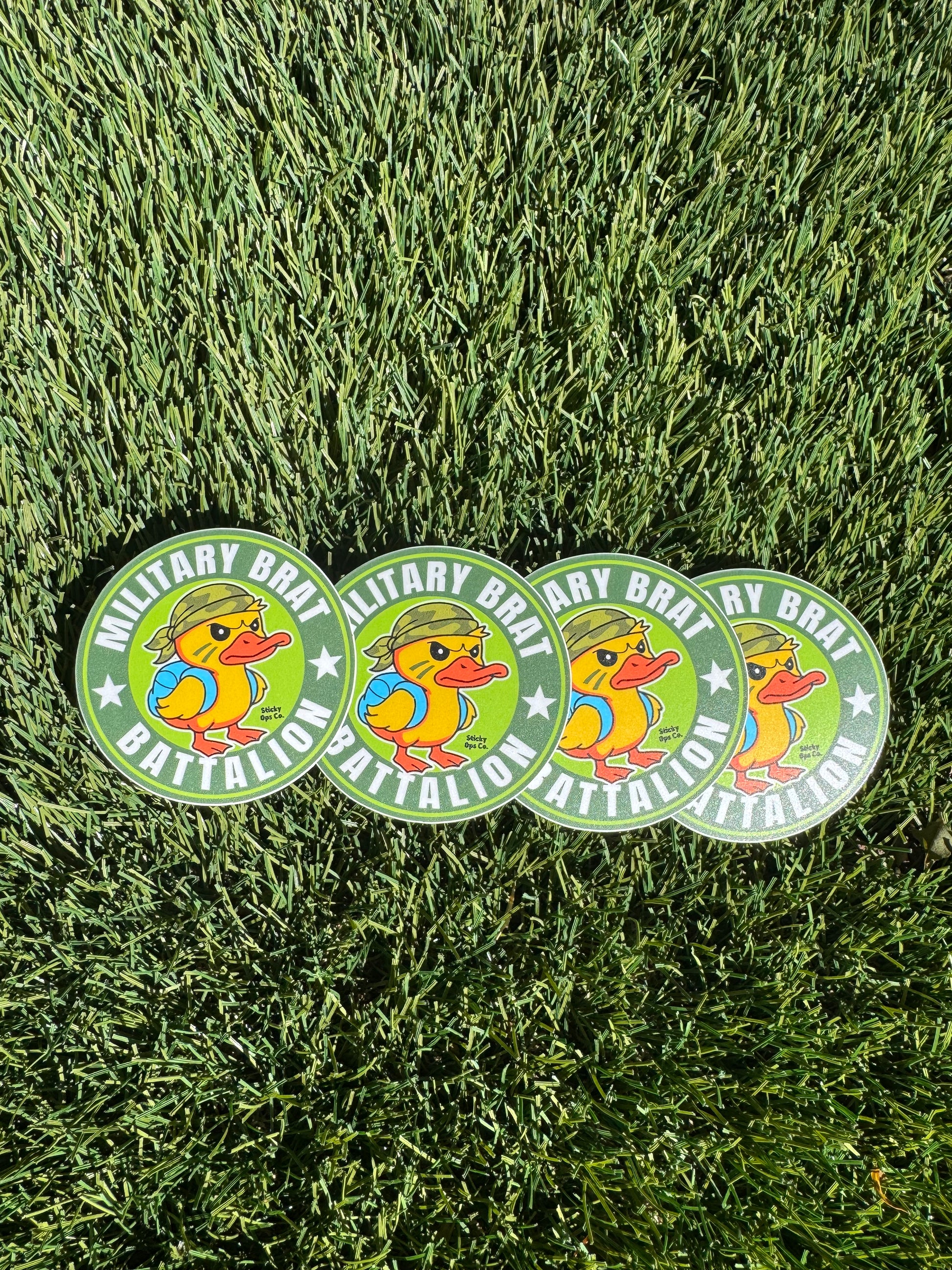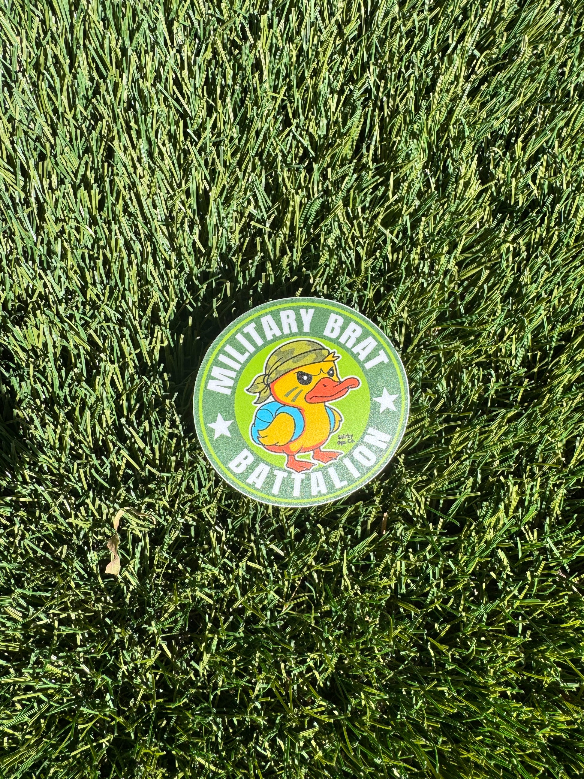 For the kids who grew up on base, learned to PCS before they could spell it, and can spot a commissary snack aisle from a mile away. This 2.5" vinyl sticker features an adorable camo-clad duck — available in both boy and girl versions — perfect for water bottles, lunchboxes, laptops, or anywhere a little military pride belongs. Durable, water-resistant, and built to survive playgrounds, road trips, and duty station moves.
