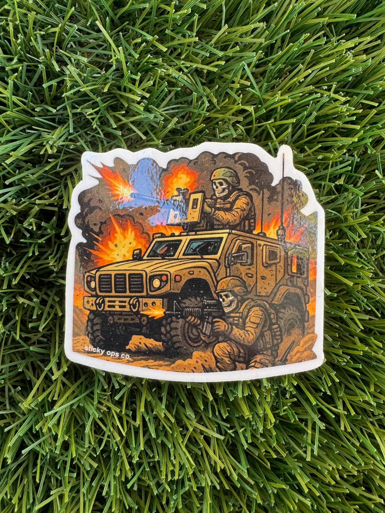 Lock and load — the MRAP Mayhem sticker brings the chaos of combat to life with a gritty skeleton crew rolling deep in their armored ride. Explosions light up the background while the gunner and dismount lay down fire, capturing the intensity of life downrange. This one’s for anyone who’s ever lived behind the armor or knows the sound of rounds cracking overhead.
