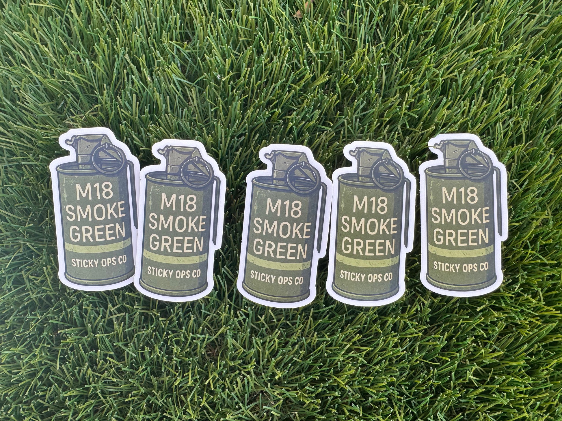 This premium vinyl sticker features a detailed illustration of the iconic M18 Smoke Grenade in its classic olive green color. Measuring 3 inches by 1.5 inches, it’s the perfect blend of tactical style and everyday durability. The design includes clear, bold lettering that reads “M18 SMOKE GREEN” with Sticky Ops Co. branding subtly placed at the bottom for an authentic, military-grade finish.